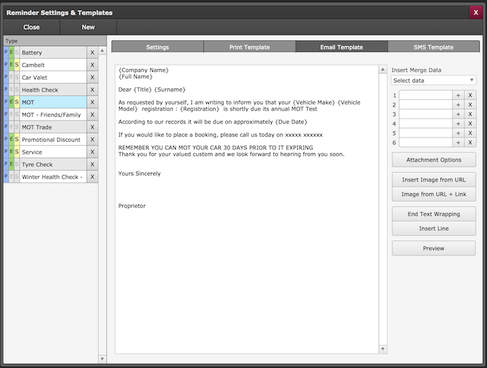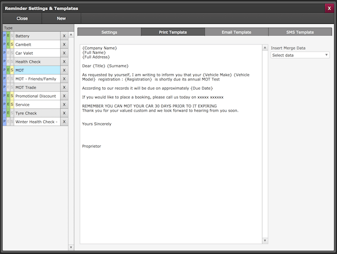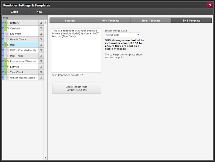 Again as with the rest of the templates, if you want the message to auto generate details from the database use the pre-defined options list (Insert Merge Data). You can also check the length of the message against your database to ensure the merged data does not push it over the single SMS limit.