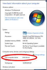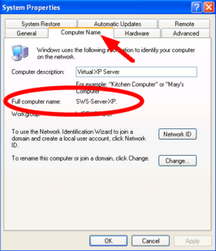 Below shows this screen on both Windows XP and Windows 7, Windows Vista will also show a similar screen to Windows 7 illustrating where the Full Computer name to use is.