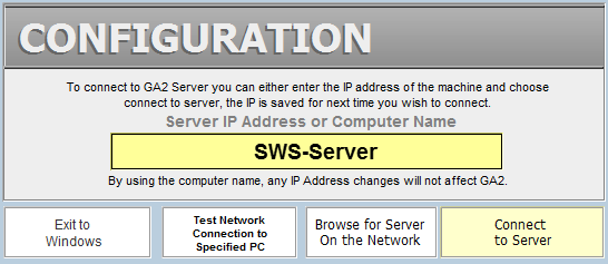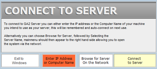 To connect to the Server PC you first need to enter either the IP address or the computer name. The computer name is the preferred option, since the IP address can change, which will cause the client to fail to connect, whereas the computer name will not change.