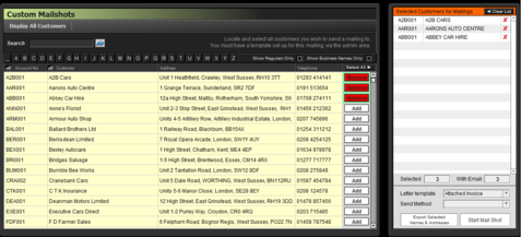 You can browse or search for a list of customers, then select them individually or select all for the mail shot Along the bottom you can choose the letter template and method for sending, followed by Start mailshot