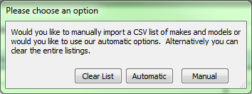 1. Clear List - which will remove all pre-defined data in GA3 2. Automatic which will then follow with two more options 3. Manual - which allows you to import from your own custom list of vehicle makes and models.