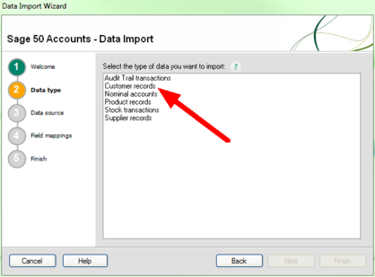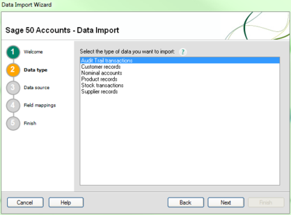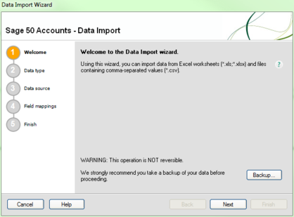 3. This will present you with the Sage Data Import Wizard as shown below, click on next to choose the data type