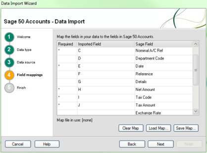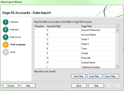 8. You will now be asked to map the fields in your data to the fields in Sage Proceed to set in order, each field from A to I as shown in the screenshot below