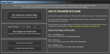 The files will be saved into a folder on your hard drive called GA_EXPORTS Each export will only export records which have not previously been posted to sage, this is to prevent possible duplicates.