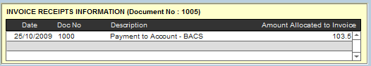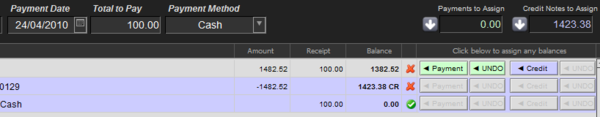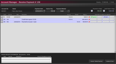 The listing will show all outstanding invoices on that account, next to each invoice is an assign payment button, which will allow you to assign payment from the available amount to pay off that invoice, by clicking on the relevant assign payment buttons for each invoice the customer is paying, the available to assign will be deducted.