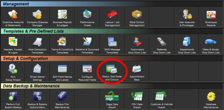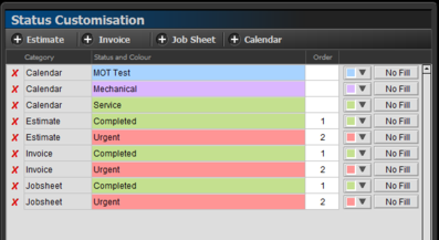You can add a status for Estimates, Invoices, Jobsheets and the Calendar. You can also manually specify a numeric sort order and a colour to use against this status.