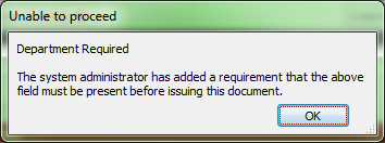 When you try to issue an invoice where a section of information is missing, you will be prompted to enter the information by a dialog box as shown below